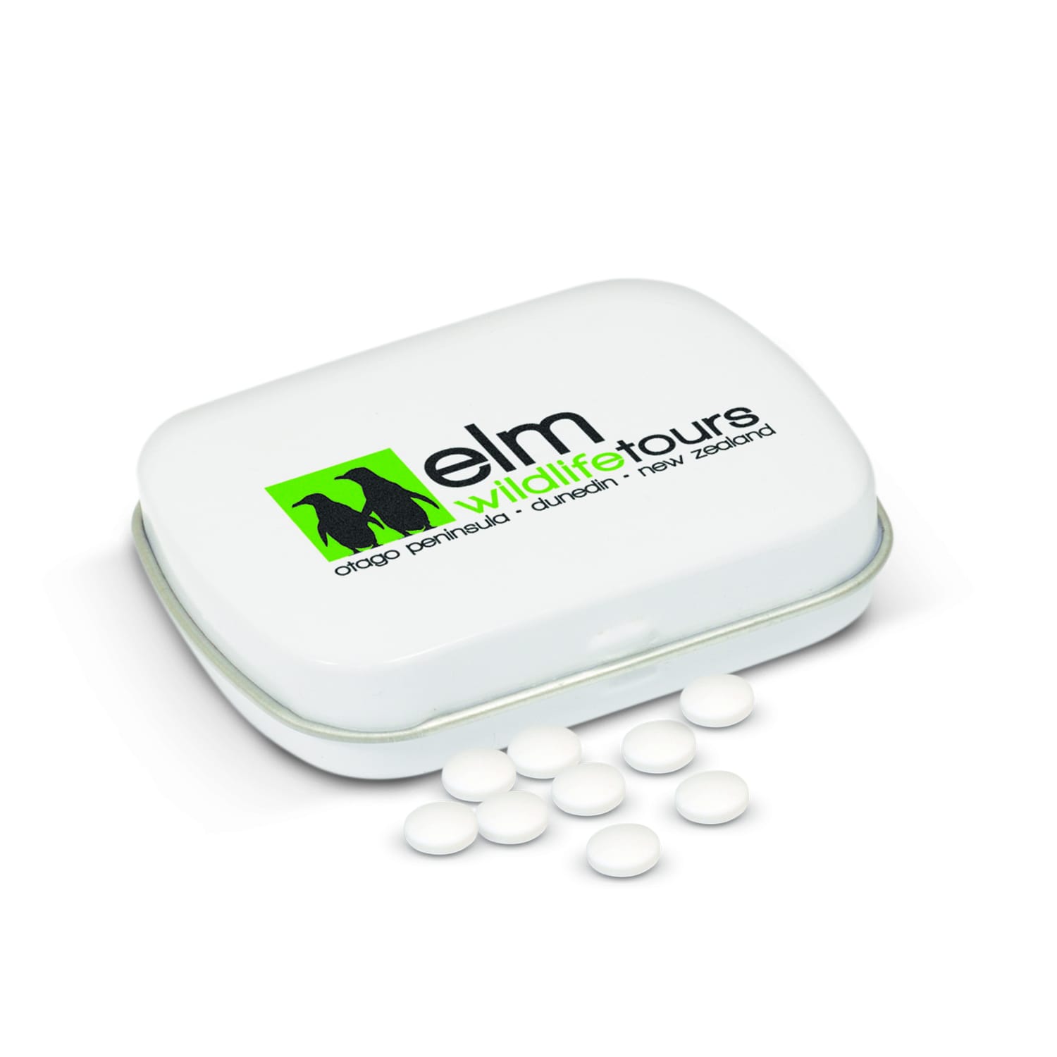 Contoured rectangular tin with a hinged lid which is filled with 14g of peppermints. Full ingredient and nutritional information is printed on the base of the tin. Features: * Metal tin with a hinged lid * 14g of peppermints * Ingredients and nutritional information printed on base